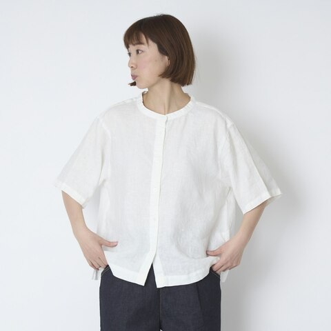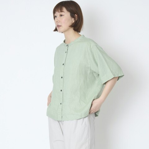 蒸し暑い時期に快適に着られるよう、デザインも工夫されています。首回りは詰まりすぎないバンドカラーで、上までボタンを留めてもほどよいゆとりがあります。