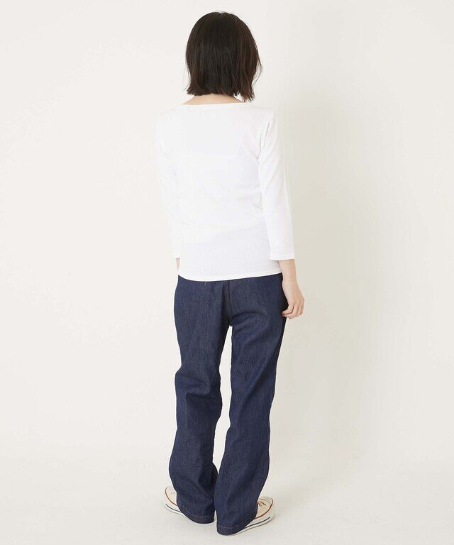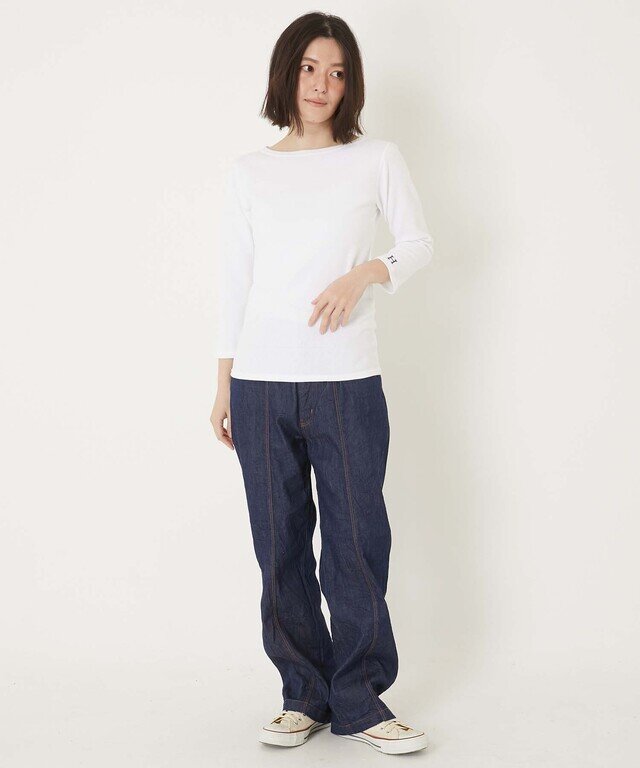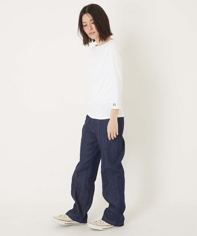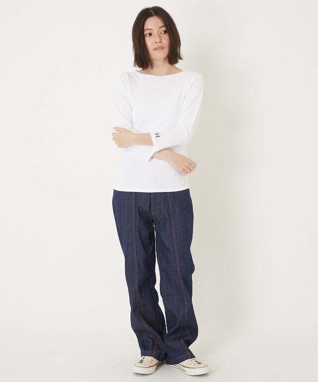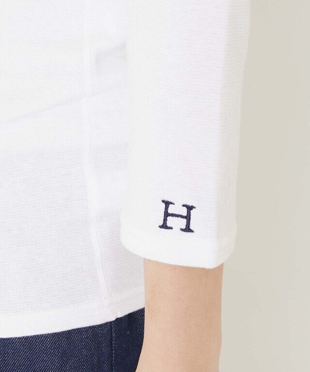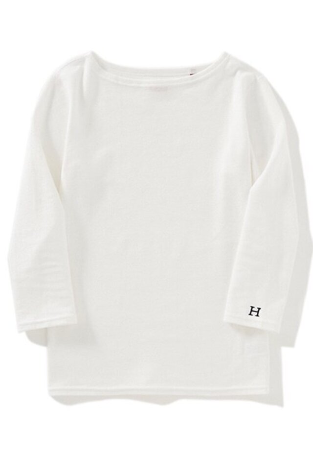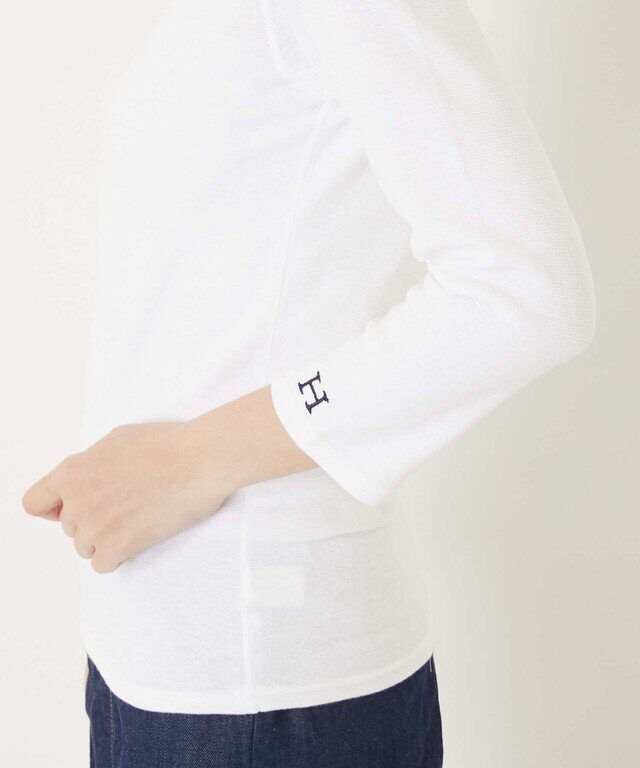 HOLLYWOOD RANCH MARKET|ストレッチフライス ボートネック ハーフスリーブ Tシャツ ウイメンズ WHITE ホワイト 白 七分袖 カットソー H刺繍 日本製