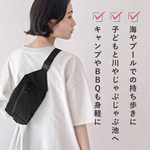 水辺やじゃぶじゃぶ池など、子どもと一緒に遊ぶ時は両手フリーでいたいもの。そんな時、ひとつあると便利なのがこんな撥水バッグです。