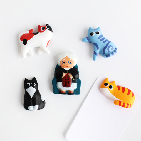 編み物をしている人とくつろぐ猫たちのデザインがかわいいマグネットセット。