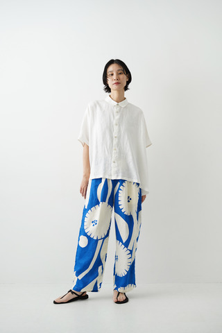 華やかなgrinオリジナルフラワープリントが目を惹くパンツです。直線的に描いた花柄は、甘くなりすぎずすっきりとした印象に。総柄ですが、リネンのナチュラルな素材感との組み合わせで、上品に着ることができます。