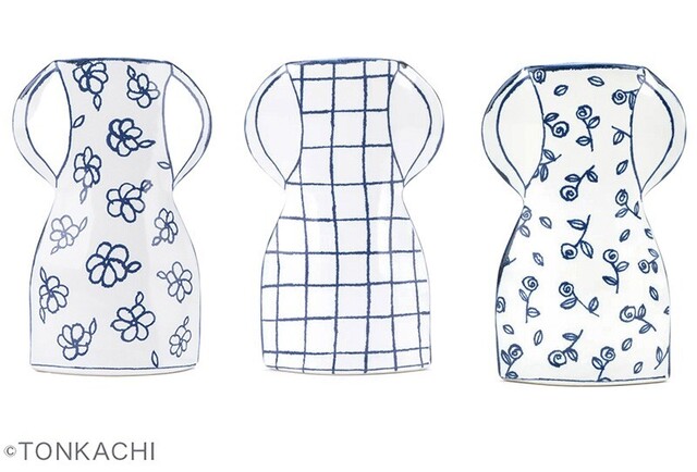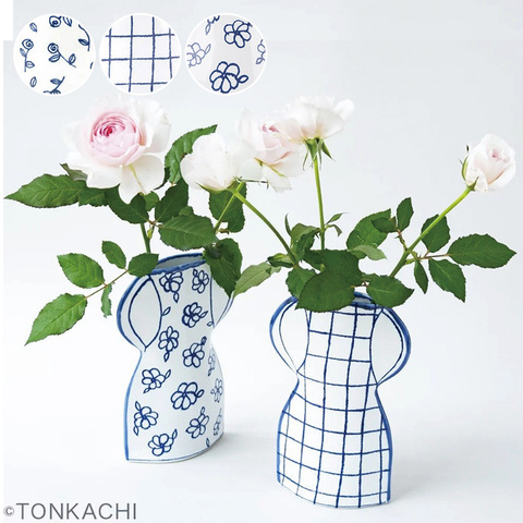 マリアンヌ・ハルバーグの代表作「フラワーベース」を原案にした彼女と日本の共同制作です。大正時代から続く愛知県瀬戸の窯元とマリアンヌが、企画段階から長い時間をかけて取り組んだ日本オリジナル作品です。特にマリアンヌブルーと言われる青の日本的再解釈、そして彼女の特徴である平面的立体というイメージをそのままに、日常使いしやすい耐久性を取り入れました。高さ約16センチ、 一輪でも小さな花束でも生けられる、場所に困らないサイズです。いずれも、マリアンヌがずっと好んでいるモチーフです。