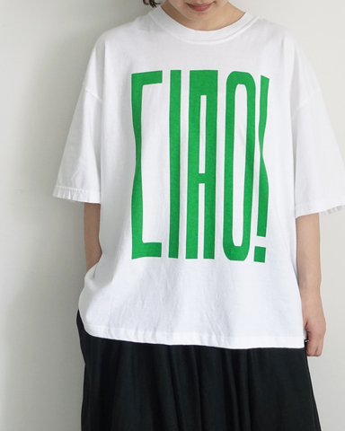 前身ごろに “ CIAO! ” 、背中には “ AMORE ”、文字なのか柄なのか、だまし絵アートのような遊び心あるプリント。