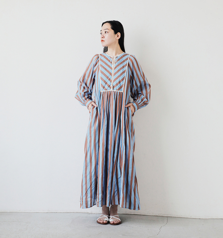 毎シーズン大人気のエスニックドレスを、〈ne Quittez pas〉らしい配色のストライプ柄で仕立てました。素材は軽くて柔らかな肌触りのコットンボイルを使用。胸元のパネルは柄をバイアスで切り替え、モダンな印象を演出しました。パネル下からギャザーが広がるフェミニンなシルエット。襟元にはタッセル付きのストリングを飾って、アクセントを添えました。