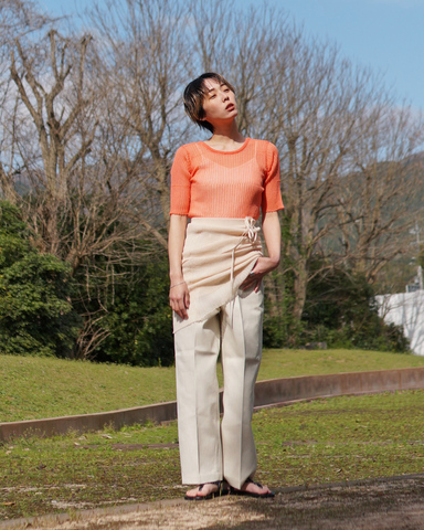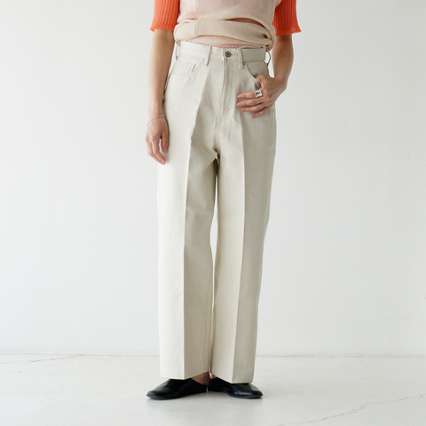 オフホワイトに杢グレーを織り交ぜた独自の色味。春夏にむいており、軽やかに穿くことができる生地感です。