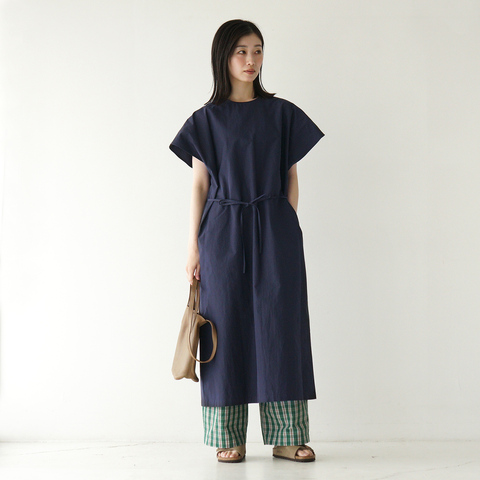 ゆるやかなシルエットが魅力のワンピースに、チェック柄パンツをレイヤードした軽やかなコーディネート。上品なネイビーの落ち着きと、柄パンツの遊び心が絶妙なバランスで調和しています。