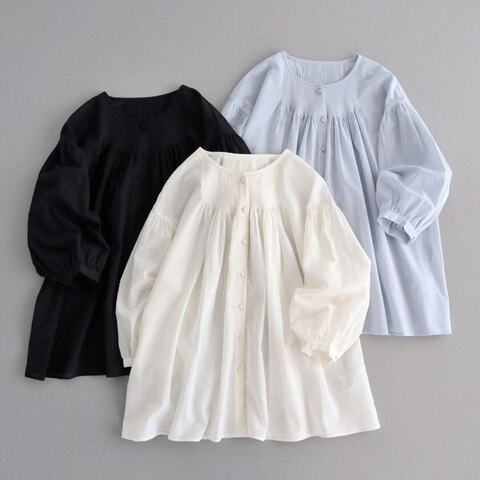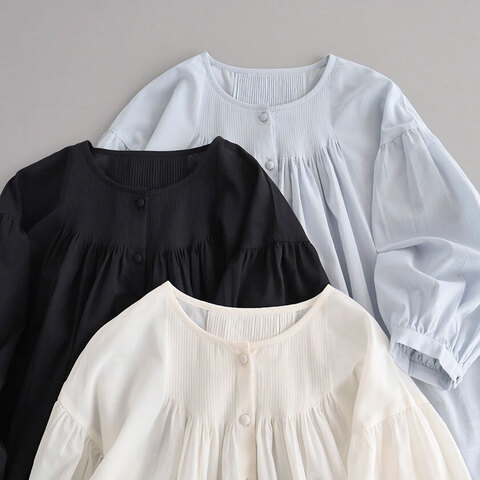 前後の身頃にあしらわれた繊細なピンタックが目を惹くデザイン。ピンタックの下からふわっと広がるギャザーが動くたびに風に揺れて繊細な表情を見せてくれます。袖は手首が出る7~8分ほどの長さで抜け感を演出。カーディガンやジャケットと合わせてもゴワつかず、すっきりと着ていただけますよ。