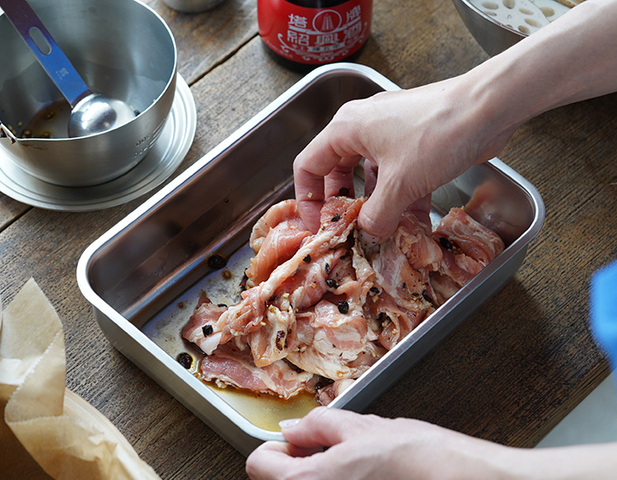 角型なので調理スペースを邪魔せずに使えます。肉や魚に下味をつけたり、常備菜の保存に丁度よいサイズです。