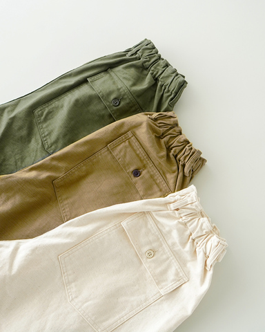生地を変えながら定期的に展開をしてる人気の定番アイテム。こちらは定番の「ジェームス ファティーグパンツ」を高密度で丈夫なバックサテン生地で制作しました。