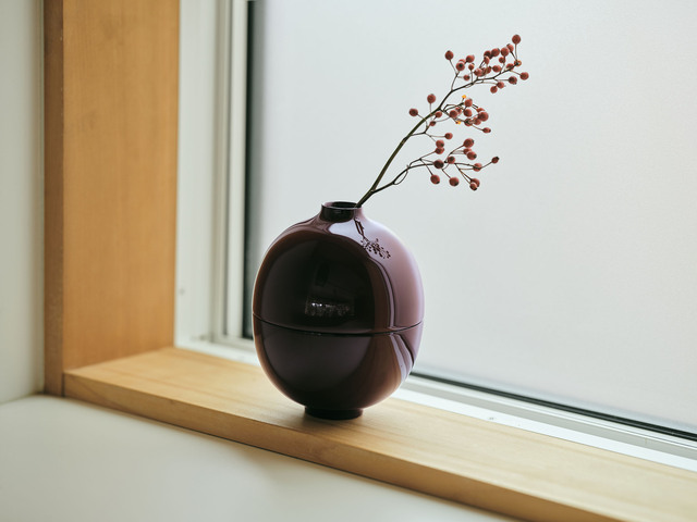 keshiki 花の椀は、お椀のフォルムをそのまま活かした、ユニークなデザインの花器です。曲線のやわらかさと、漆器ならではの艶感が、シンプルながら存在感のあるしつらえに。