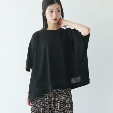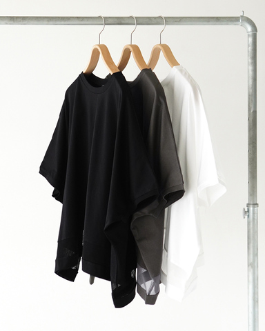 裾のメッシュ切替が目を引く、ゆったりシルエットのワイドプルオーバー。ドロップショルダーに加え、落ち感のあるラインが立体的な動きを演出します。