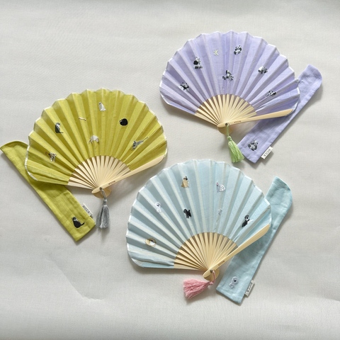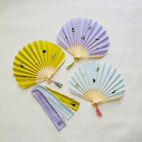 3種類の動物の刺繍を施した扇子は、本体の綿麻生地にニュアンスカラーの3色をセレクトしました。