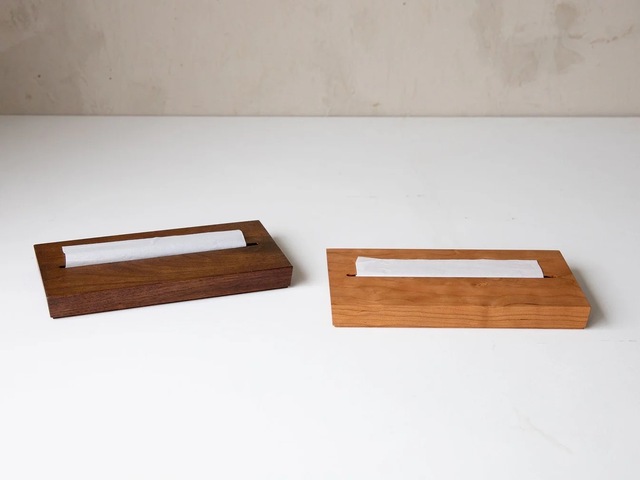 福岡県糸島市の家具工房、みはたやによるティッシュケースです。ウッド素材のみで構成されたシンプルなデザイン。無垢材を用いて丁寧に作られており、今まであまり目立たせたくなかったティッシュケースを、気兼ねなく配置できる美しい佇まいです。