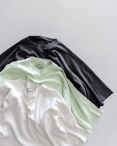 まるでヴィンテージのスウェットをリメイクしたかのような一着。製品染めによる味わい深い色合いと、袖下にガゼットが繋がるピポットスリーブが特徴的。