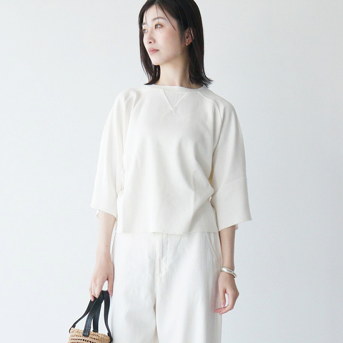 柔らかな光を反射するようなホワイトトーンでまとめた、クリーンでナチュラルなワントーンコーデ。ゆったりとしたシルエットが、風をはらむような軽やかさと心地よさを演出してくれます。