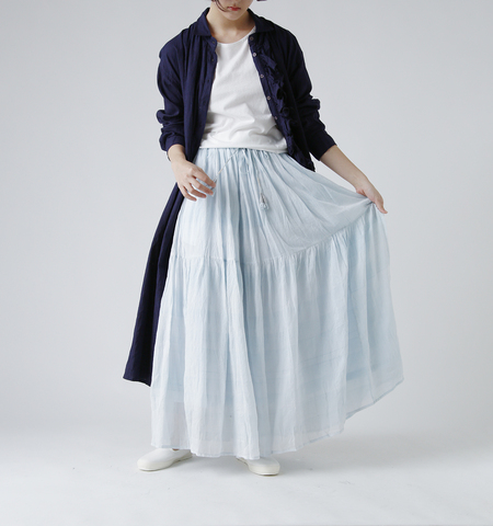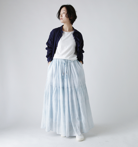 極薄のエアリーなコットンシルクの素材を使用し、ギャザーをたくさん入れた贅沢なティアードスカートです。洗いのシワ感で広がり過ぎず、甘さを抑えたアイテムとなっています。オーバーサイズのアウターやコンパクトなトップスなど様々なアイテムとスタイリングしやすいスカートです。