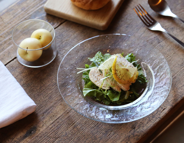 シンプルなガラスの器だからこそ、元気な色合いの食材がよく映えて、メインディッシュでも副菜でも、小粋な一品に仕上げてくれます。