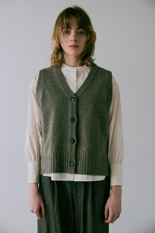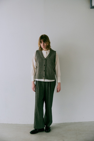 Vネック開きでシャツやアウターのインナーにも合わせやすいベスト。