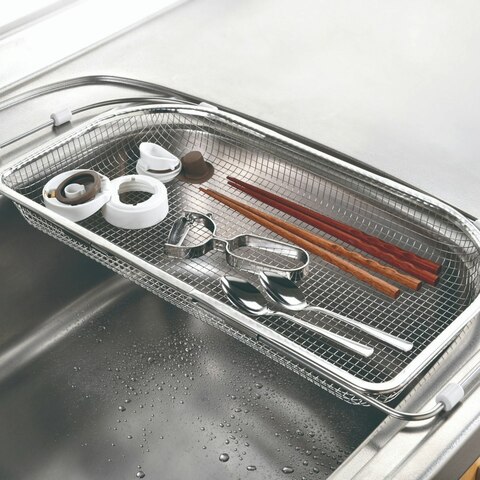 こちらの水切りかごはシンクに渡して使うタイプです。調理台に水切りかごを置かなくて済むので、調理台を広く使えるんですね。キッチンのスペースを無駄なく使い、しっかりと水切りができます。キッチンが狭いご家庭では特に重宝しますよ。