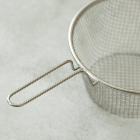 つくり手は新潟県・燕三条でざるを得意としたものづくりを行う新越ワークスです。新越ワークスだからこそ、製品に合わせた金網選びができるんですね。こちらのバスケットに採用したのは「溶接金網」と呼ばれるもの。細い径の鉄を縦横直角に並べ、交わる点を溶接した金網です。油切れが良いように目は粗めですが、交わる点が溶接されていることでベコベコしません。丈夫で強度が高いので、ずっしりとした食材を入れても変形することなく、安定してお使いいただけます。