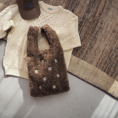 トレンド感のあるフラッフィーなファー素材に、マーガレット・チューリップ・スズランのお花の刺繍を施したショッパー型バッグ。毛足が長いふわふわのファーとお花の刺繍の組み合わせで、装いにキャッチーなアクセントを取り入れられるアイテムです。