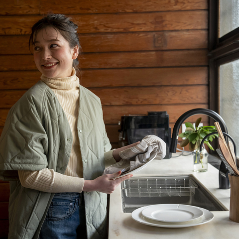日本伝統の生活着であるはんてんの形状や特徴を活かし、今のエッセンスを加えた冬の新たなスタンダードウェア。ゆったりとした着心地、すっきりとした襟元。 重ね着しても窮屈にならないアームホール。作業や家事がしやすい袖丈。家で過ごす時、外に出る時もさっと羽織れる。