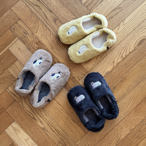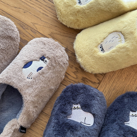 微笑んでいるようなきゅっと上がった口角と、脱力感のある目元がかわいい猫の刺繍が入ったルームシューズ。手触りの良いふわふわのファーをインソールにも使っているので、あたたかく履き心地も抜群です◎