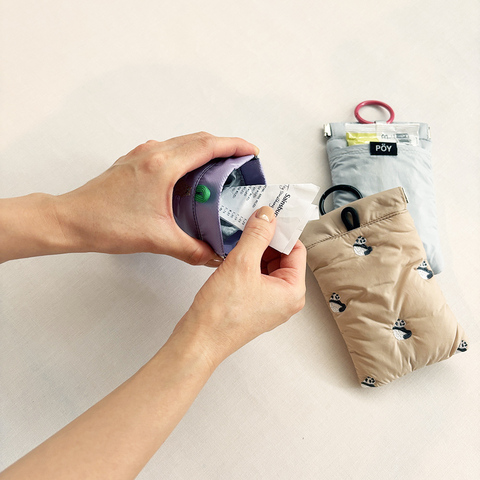 ウェットティッシュ程度の湿り気のものならポーイに入れることができます◎当日中に必ず中のゴミを捨てて、アルコールの除菌シートでふき取るなどしてください。ポケットやバッグに直に入れると湿って困る、外出先でウェットティッシュを使ったときのお悩みも解決してくれます!