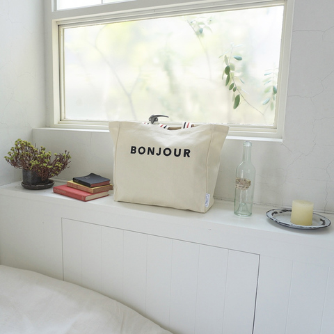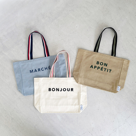 ナチュラルな雰囲気の生地を使用し、ワンポイントになるフランス語を立体感のあるチェーンステッチ刺繍で施しました。幅広で肩掛けしやすい持ち手は、バッグの色によって違う配色に。マチ付きでたっぷり物が入るシンプルなトートバッグで、お買い物用としてはもちろん、普段使いのバッグとしても活躍します。