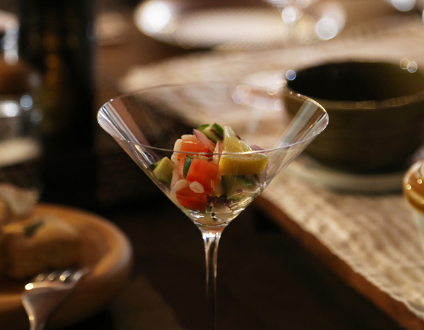 ワインのおつまみ「スパイスマリネ」。グラスの透明度が高く、トマトやキュウリなどの野菜が、色鮮やかでとても美味しそう。