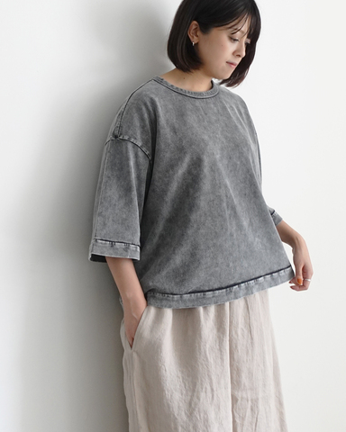 透け感なく着れ軽やかな差し色になるアイボリー、ドライタッチでニュアンスある色合いチャコールの2色。ムラのある独特な雰囲気の色味に染め上げました。