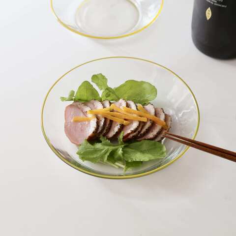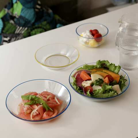 ボウルや異なるサイズのプレートと幅広いラインナップで、食卓に料理に清涼感を運んでくれるガラスの器です。
