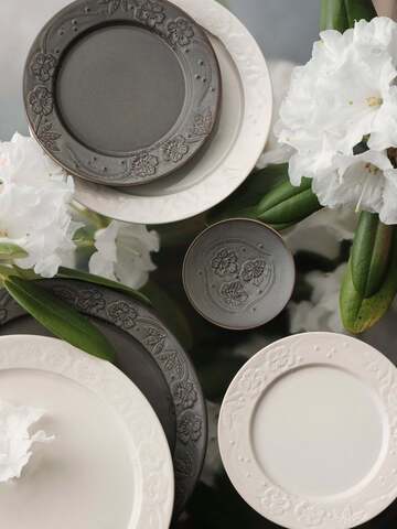 ほんのりつややかな仕上がりのやさしい色合い中に、さりげなく浮かび上がる模様が美しい白色。しっとりとしたマットな質感に、縁にほどこされたシャクナゲの模様が光の加減でふわりと浮かび上がるグレー。どちらも派手すぎず、でもきちんと存在感があり、料理を引き立てながらも器としての美しさもしっかり感じられます。