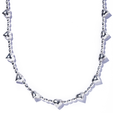 立体的なハートと、きらりと輝くシルバーボールをリズムよく連ねた、視線を奪うチャーミングなネックレス。