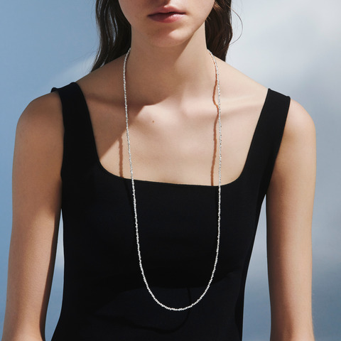 90 cmのロングネックレスは1本で纏うのはもちろん、チョーカーとネックレスのように2連にしてレイヤードスタイルを楽しむのも。