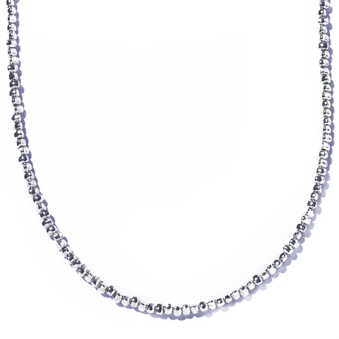 水滴がこぼれ落ちる瞬間をとらえたような、繊細なシルバーボールを連ねたネックレス。