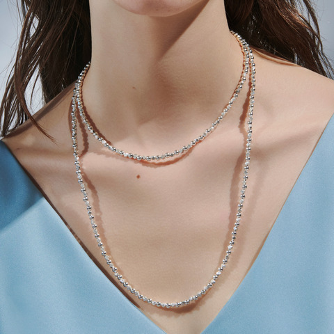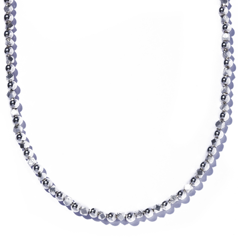 艶やかなシルバーボールと、マットな質感の多面カットボールを交互に配した、構築的なシルバーネックレス。