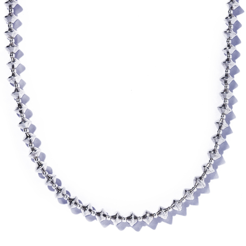 シルバーの艶やかな輝きが、角度を持つ三角錐のフォルムに絶妙な光沢を与え、見る角度によって様々な表情を作りだします。