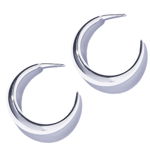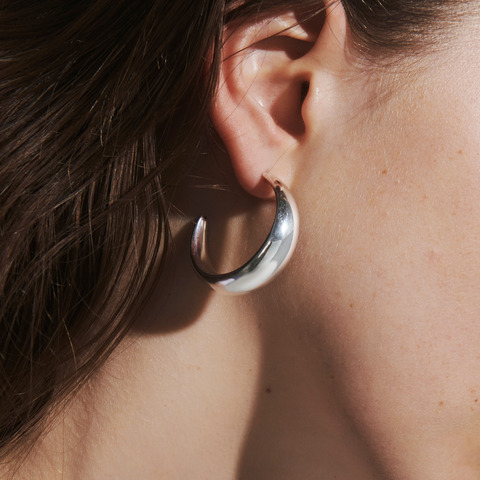 丸みを帯びたフォルムに、シルバーの艶やかな光沢が映えるボリュームフープピアス。
