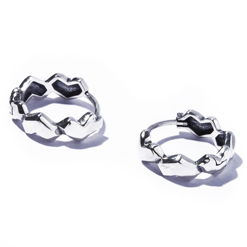 やわらかな光沢を帯びたシルバーに、横長のハートが等間隔に並ぶミニマルなフープピアス。