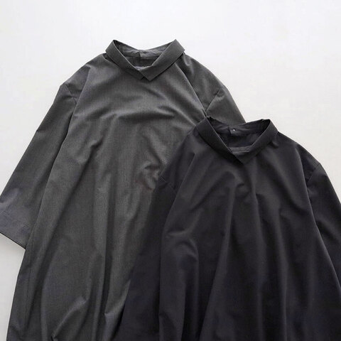ゆったりと裾に向かって広がるAラインシルエット。落ち感があるので広がりすぎずスッキリと着れて、丈もたっぷりあるため素足でも安心して着用できますよ。装飾を抑えたシンプルなフロントのデザインと、首元で重なった立体的な襟がクラシカルで凛とした佇まいを惹き立たせます。袖はシーズンレスで着用しやすい半端袖。手首が見えることで手元を華奢に見せてくれるうえ、腕時計やブレスレットなどアクセサリーとの相性も抜群です。