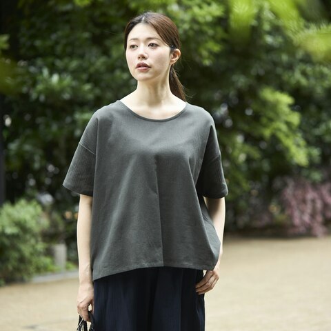 腕まわりや身幅、背中まわりもゆとりがあり、生地が肉感を拾わないので自分では見えないところも着やせして見えます。また、生地に凹凸があるので、1枚で着ても透けにくいのも嬉しいポイントです。