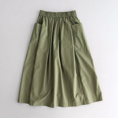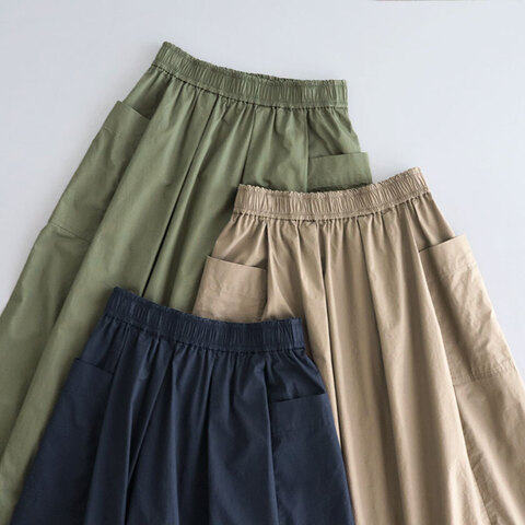 デザインは大きめのサイドポケットが印象的なカーゴタイプ。ウエストからあしらわれたタックがふわっとしたボリュームのあるフレアシルエットを表現しています。脚のラインを気にせず穿ける長めのロング丈に、窮屈感のないゴムウエスト仕様で普段スカートを着用しない方にもオススメですよ。ウエストの内側にはサイズ調整用のドローコードが付いています。