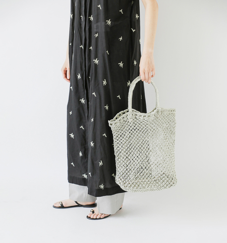 ふわっと大き目の編み目で軽やかに編み立てられた編み地はしっかり透け感があって清涼感たっぷり。そしてほどよい伸縮性があります。荷物の重みによって、バッグの形状が少し変わることがありますので、あらかじめご承知おきくださいませ。
