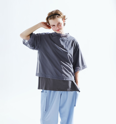 Tシャツの上にシアートップスを重ねたセットアイテムです。