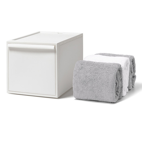 毎日着る服や、タオル、バッグなどが収納できるLサイズ・オールホワイト2個セット+竹製天板のページです。