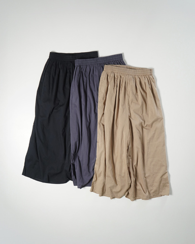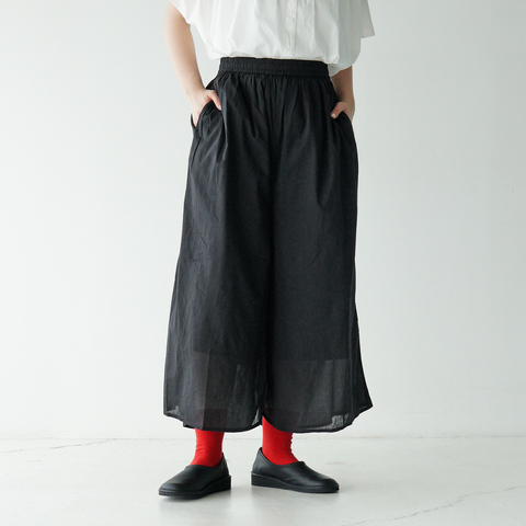 フロントとバックにたっぷり入れたギャザーが、ふんわりと広がるワイドなシルエットを生み出します。2重仕立てで透け感を気にせず、ウエストはリブゴム×スピンドルでストレスフリーな穿き心地。