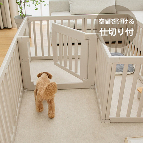 ■サークル内を仕切ることのできる新しいペットサークル<br> 付属の仕切り柵を使って二部屋にしたり、遊び場や寝室、トイレを分けることが可能です。<br> 多頭飼いでサークルを分けて使いたい時にもおすすめです。<br><br> ■優しい色味とシンプルなデザイン<br> 優しい色合いとシンプルな形状で檻感のないデザインが魅力です。<br><br> ■ドア付きで出入りラクラク<br> ドア付きなので出入りも楽々。扉の外にロックが付いており、内側からは開けられない設計です。<br><br> ■安心素材<br> 木製や鉄製と違い、材質が高密度ポリエチレンのため錆びることもありません。<br> ホルムアルデヒドも未検出で安心です。<br><br> ■耐久性◎<br> HDPE素材に高密度原料を配合しているため、耐久性に優れており長くお使いいただけます。<br><br> ■ワンちゃんが飛び出さないサイズ<br> 高さ65cm、サークル柵の間の幅6cmとワンちゃんが外へ出れないサイズ設計で安心です。<br><br> ■吸盤付きでしっかり固定<br><br> ■軽量でお掃除ラクラク<br><br> ■どなたでもカンタンに組立可能<br><br> ■L型やコ型のフェンスとして<br> 別売りのスタンドパネルを使用すれば、I型、L型、コ型のフェンスとしても活用可能です。<br><br> ■空間に合わせて選べるサイズ<br><br> ■選べる仕切りタイプ<br><br>
