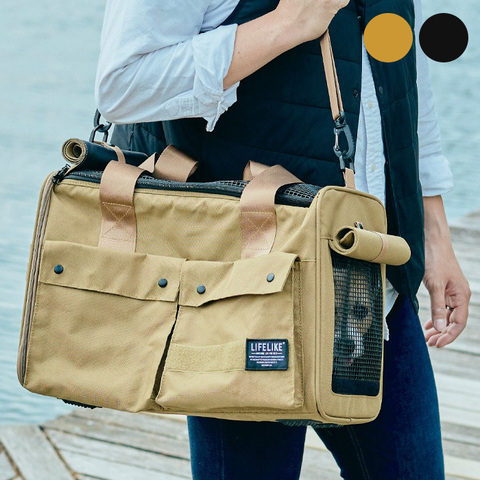 アウトドアデザインを取り入れた絵、ボックス型のペットキャリー。<br>型崩れしにくいので、安心してワンちゃんとのお出かけを楽しめます。<br>非常時の簡易ハウスとしてもお使いいただけるデザインです。<br><br>・上部はメッシュ窓にもなる二重蓋仕様。<br>通気性がよく、ワンちゃんの様子ワンちゃんの様子も外からしっかり確認できます。<br><br>・サイドにもメッシュ窓付き。<br>ワンちゃん自身も外の様子を見ることができるので、移動時のストレス軽減にも◎。<br><br>・付属のショルダーストラップを使えば、両手があいた状態でお出かけを楽しむことができます。<br><br>・底板はベルクロ仕様で簡単に取り外し可能。<br>長く清潔にお使いいただけます。<br><br>・耐久性・防水性・軽量性に優れたポリエステル生地を使用。<br>汚れてもすぐにお手入れできるので、安心してアウトドアシーンを楽しめます。<br><br>・正面にはマチ付きポケットを配置。<br>マナー袋やおやつの小袋など、かさばるアイテムたちをしっかり収納できます。<br>ベルクロで取り外せるブランドロゴワッペンがポイントに。<br><br>■LIFELIKE(ライフライク)とは<br>~AWESOME LIFE FOR PETS~<br>ペットにとって素晴らしい生活をコンセプトに、トレンド・機能性・楽しさを兼ね備えたラインナップが魅力の犬用品ブランドです。
