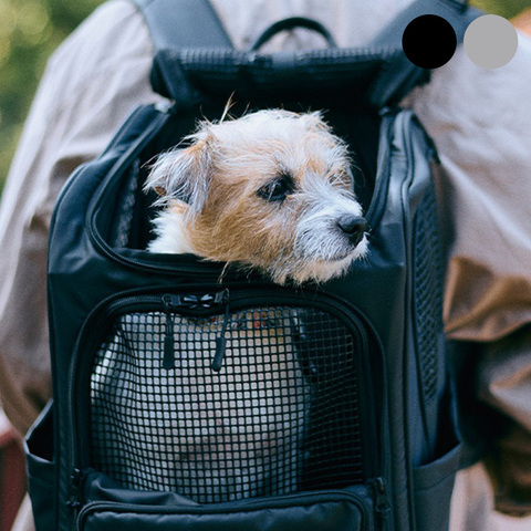 ユニセックスなデザインが使いやすい、スタイリッシュなバックパック型ペットキャリー。
